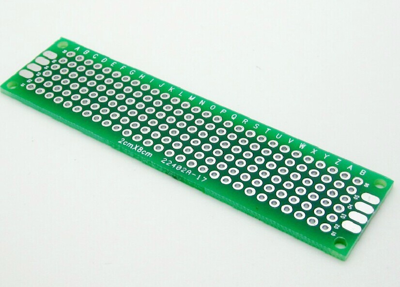 The 2 x 8 cm double-sided universal PCB prototype board is a compact and durable solution for developing and testing electronic circuits. With plated-through holes and standard 2.54mm spacing, this board supports solid soldering on both sides—ideal for dense or complex component layouts.